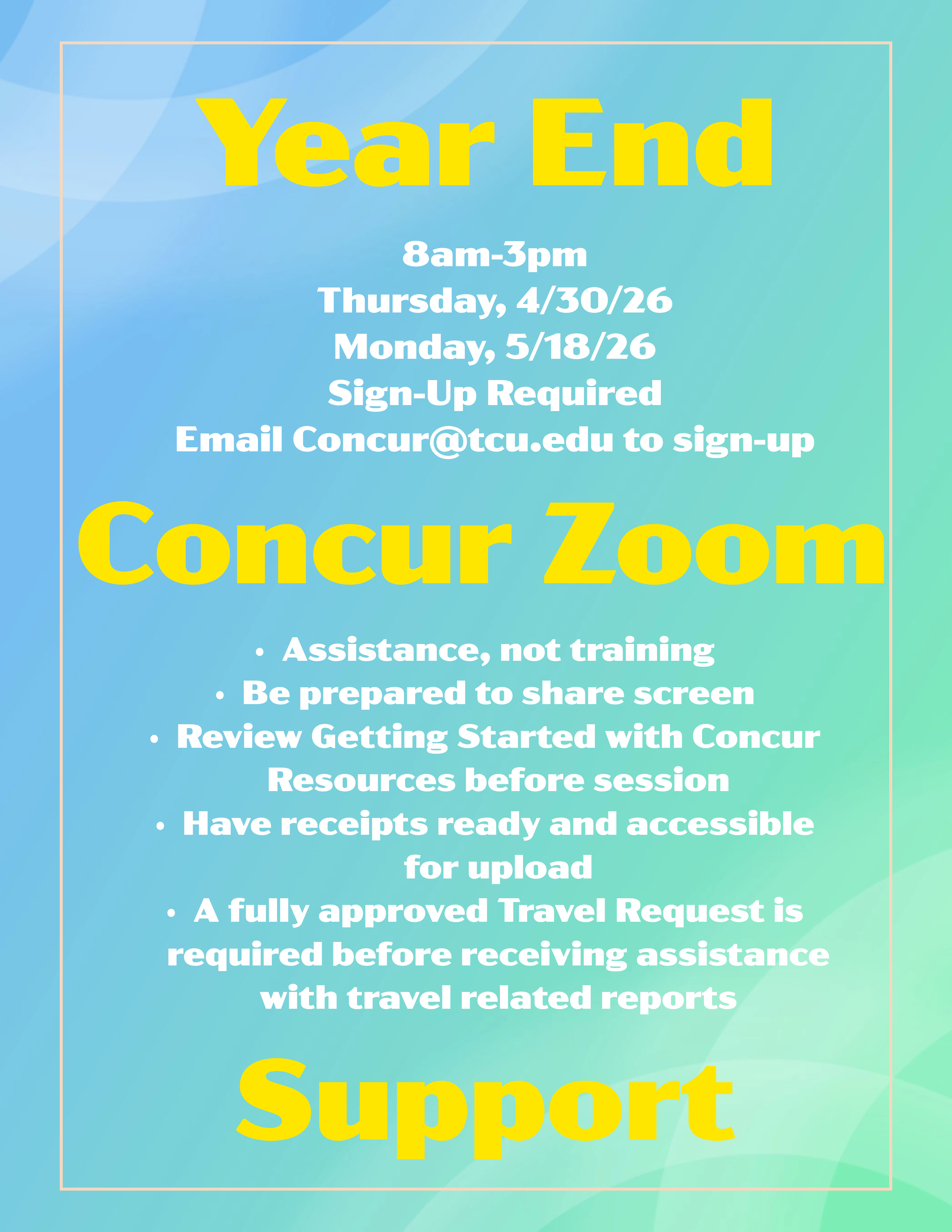 TCU uses Concur to make managing your travel and expenses as simple as possible. It offers a suite of tools and services including online booking and expense management. We also have a dedicated travel agent through Anthony Travel, as well as agents who are accessible 24/7; convenient mobile apps; and university credit cards. Our goal is to provide the University with safety, service, and savings.